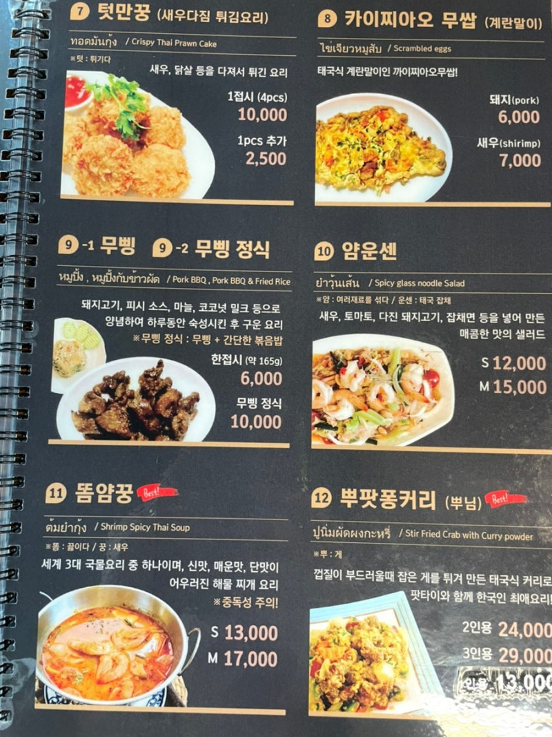 또한, 태국식 볶음밥과 똠양꿍도 추천해요. 똠양꿍은 매콤하고 시원한 국물 맛이 일품이에요. 가격은 10,000원 정도로, 한 끼 식사로 충분해요.