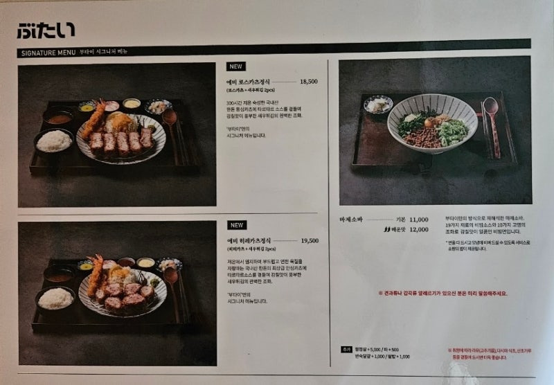 부타이 1막의 메뉴는 다양하고, 특히 돈카츠가 유명해요. 대표적인 메뉴로는 히레카츠와 로스카츠가 있는데, 가격은 각각 18,500원과 16,500원이에요. 이 외에도 다양한 튀김 세트와 비빔밥도 인기랍니다. 비빔밥은 11,000원과 12,000원으로 두 가지 사이즈가 있어요. 메뉴판을 보면 다양한 일본 요리를 한눈에 볼 수 있어요.