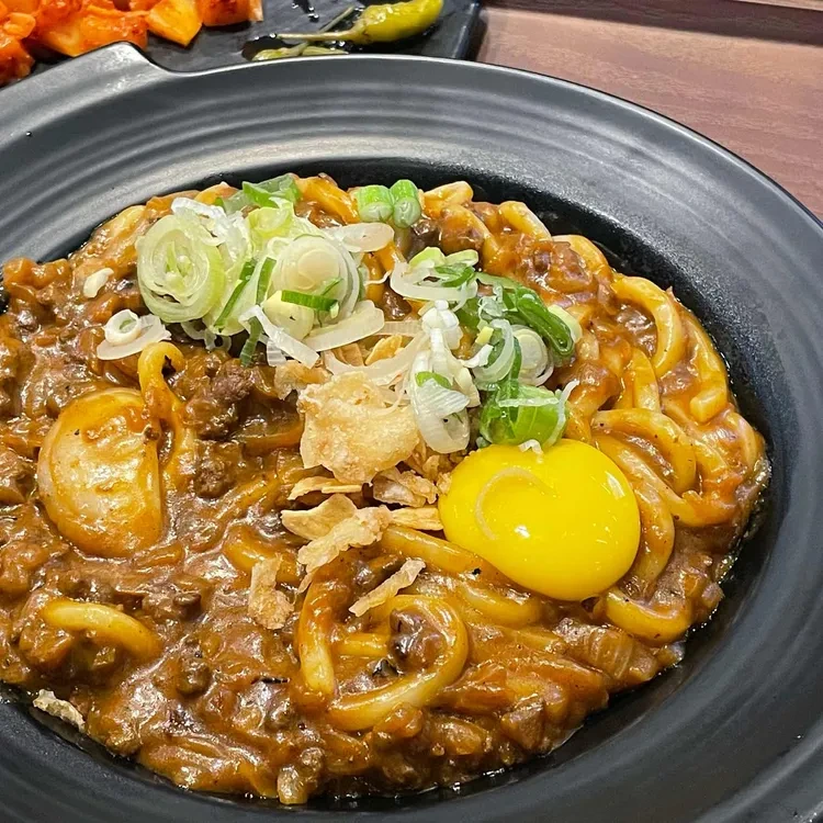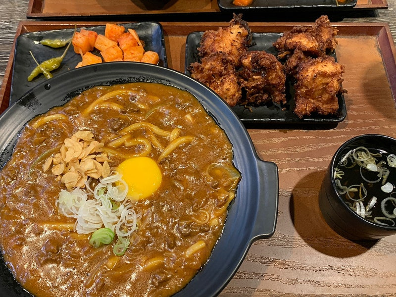 야기카레의 메뉴는 다양하지만, 특히 추천하고 싶은 메뉴는 '카레 우동'과 '카레 덮밥'이에요. 카레 우동은 진한 카레 소스와 쫄깃한 우동 면이 조화를 이루며, 위에 올려진 생달걀 노른자가 고소함을 더해줘요. 가격은 약 8,000원 정도로, 양도 푸짐해요.