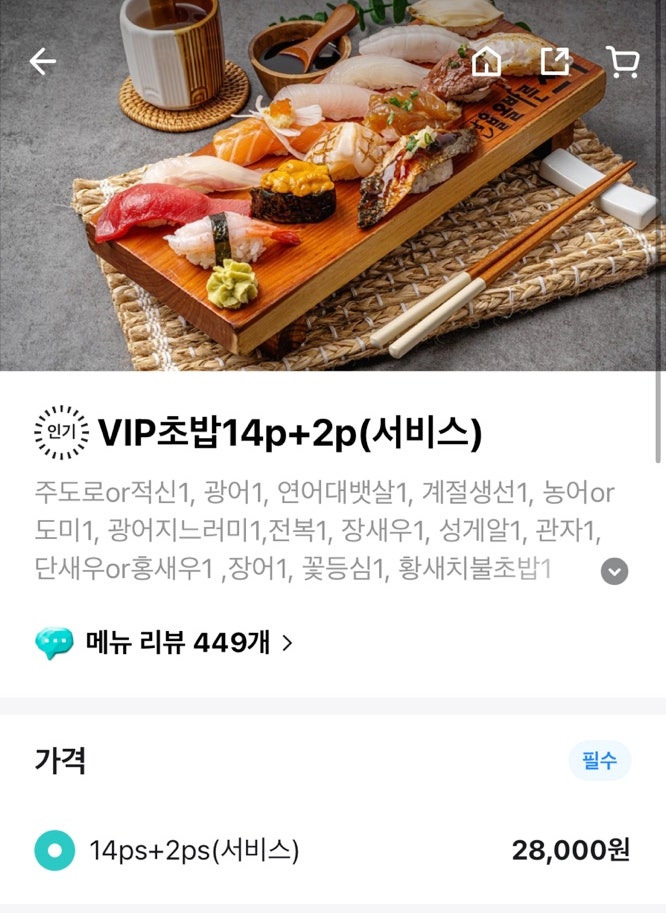 올바른스시의 메뉴는 다양하고, 특히 추천하고 싶은 메뉴는 'VIP 초밥 14p + 2p (서비스)'에요. 가격은 28,000원으로, 다양한 종류의 초밥을 한 번에 즐길 수 있어요. 초밥 외에도 우동 정식이 인기인데, 초밥 7p와 우동이 함께 나오는 점심 메뉴로 가성비가 뛰어나요.
