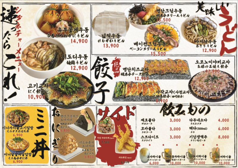 메뉴판을 보면 다양한 우동과 교자 옵션이 있어요. 해물 우동, 매운 우동, 그리고 다양한 사이드 메뉴도 준비되어 있답니다. 가격대는 5,500원부터 15,500원까지 다양해서 선택의 폭이 넓어요.