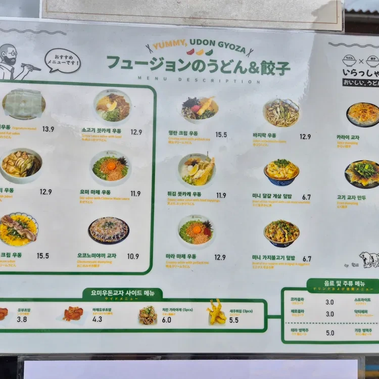 요미우돈교자의 메뉴는 다양하고, 특히 우동과 교자가 유명해요. 제가 추천하는 메뉴는 '명란 치즈 교자'와 '바지락 우동'이에요. 명란 치즈 교자는 고소한 치즈와 짭짤한 명란이 조화를 이루어 정말 맛있어요. 가격은 12,900원으로, 가성비도 뛰어나답니다. 바지락 우동은 신선한 바지락이 듬뿍 들어가 있어 해물의 풍미가 가득해요. 가격은 15,500원이에요.