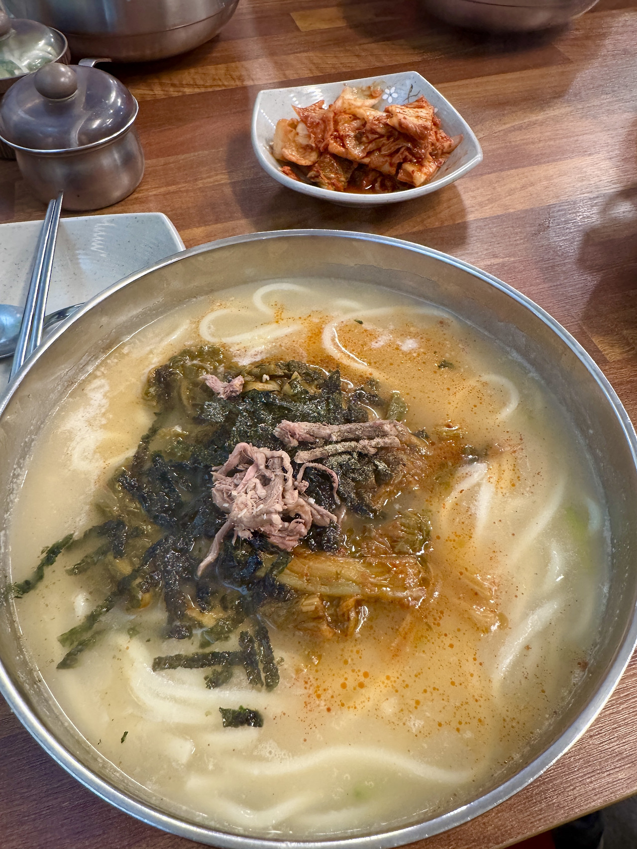 이제 칼국수의 맛에 대해 이야기해볼게요. 국물은 사골로 우려내서 깊고 진한 맛이 나고, 면은 수제로 만들어서 쫄깃한 식감이 정말 매력적이에요. 고명으로 올라가는 고기와 파가 국물의 풍미를 더욱 살려주죠.
