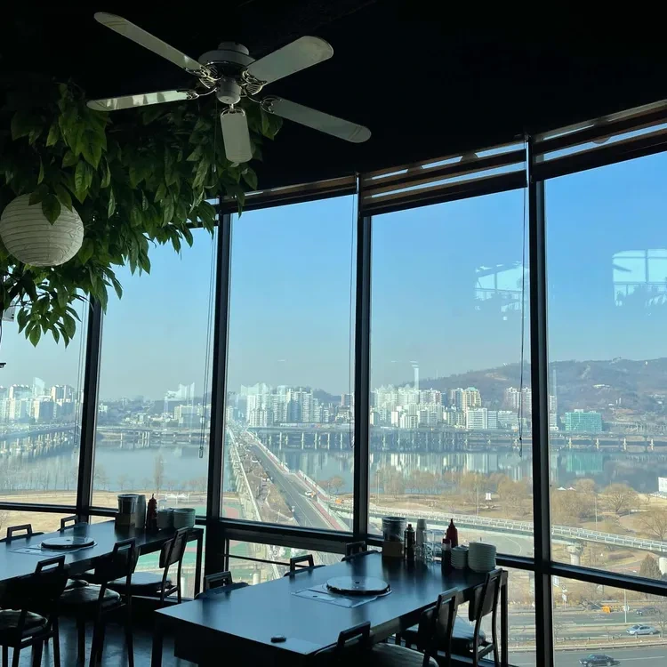 식당 내부는 현대적인 디자인으로 꾸며져 있어요. 큰 창문을 통해 한강과 도시의 경치를 감상할 수 있는 점이 정말 매력적이에요. 특히 저녁에는 조명이 아늑하게 밝혀져 로맨틱한 분위기를 연출해요. 다양한 좌석 배치가 되어 있어 친구들과의 모임이나 데이트 장소로도 적합하답니다.