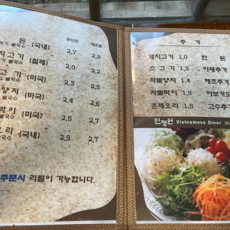 인정원 월남쌈의 메뉴는 정말 다양해요. 특히 추천하고 싶은 메뉴는 돼지고기와 소고기 월남쌈이에요. 가격은 돼지고기 월남쌈이 20,000원, 소고기 월남쌈이 22,000원 정도로, 가격대도 적당해요.