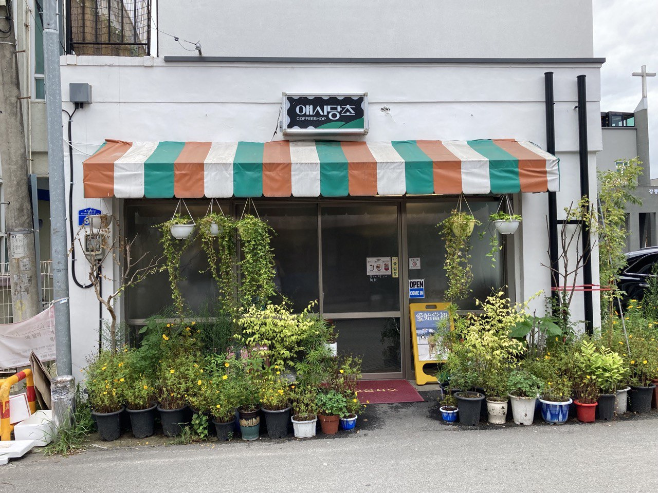 애시당초는 강릉 초당동에 위치한 카페로, 레트로한 감성이 물씬 풍기는 곳이에요. 주소는 강원도 강릉시 초당동 123-4번지로, 주변에 다양한 관광 명소가 있어 여행 중에 방문하기 좋은 위치에 있어요. 카페 외관은 아기자기한 느낌으로, 다양한 색상의 스트라이프 천막이 인상적이에요.