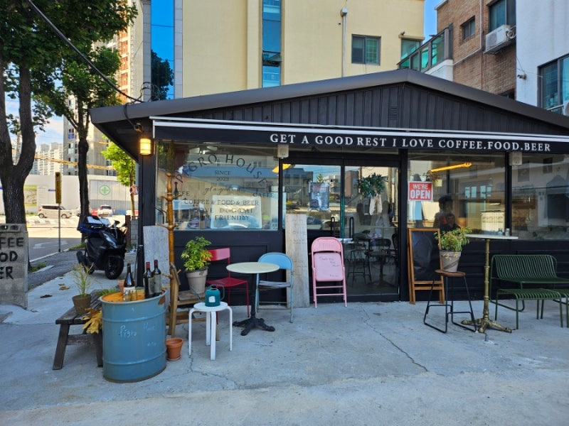 건물의 외벽은 블랙 톤의 나무 구조로 되어 있고, 넓은 유리창 덕분에 내부가 잘 보이는데요. 입구에는 "GET A GOOD REST I LOVE COFFEE.FOOD.BEER."라는 문구가 적혀 있어, 이곳에서의 편안한 시간을 기대하게 만들어요.