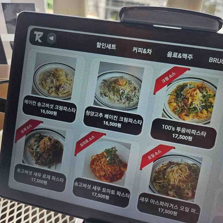 여기 메뉴는 정말 다양해. 특히 파스타가 유명한데, 내가 주문한 메뉴는 '베이컨 송고버섯 크림파스타'야. 가격은 17,500원이었고, 크림 소스가 진하고 베이컨과 송로버섯의 조화가 일품이었어. 또 다른 추천 메뉴는 '청양고추 베이컨 크림파스타'인데, 매콤한 맛이 일품이야. 가격은 16,500원이야.