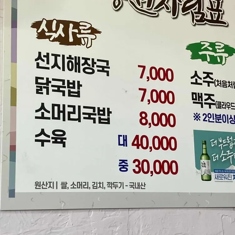 이곳의 대표 메뉴는 해장국이야. 특히 선지해장국이 유명한데, 가격은 7,000원이야. 그 외에도 닭국밥과 소머리국밥이 각각 7,000원과 8,000원이야. 수육도 인기 메뉴인데, 사이즈에 따라 30,000원과 40,000원이니 참고해. 메뉴판을 보면 다양한 선택지가 있어서 고민할 필요가 없어.