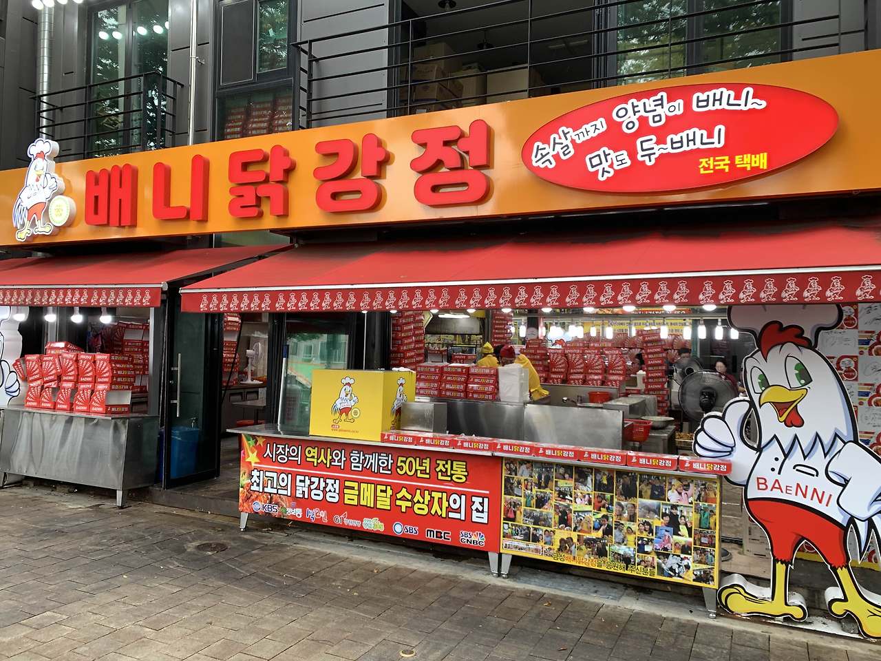 간판에는 '배니닭강정'이라는 이름이 큼지막하게 적혀 있고, 주변에는 이곳의 역사와 수상 경력을 알리는 배너들이 걸려 있어요. 이곳은 항상 사람들로 붐비는 인기 있는 식당이에요.