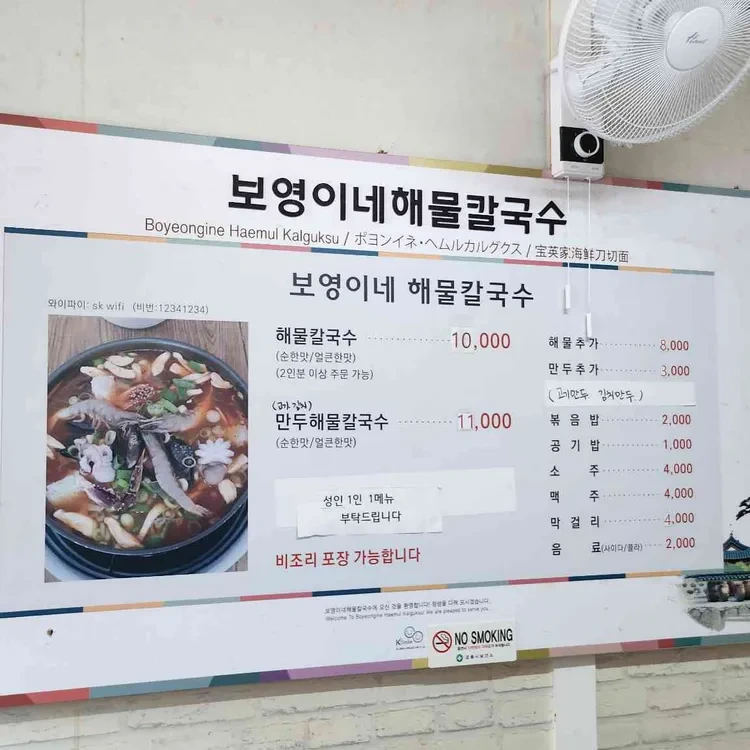 해물칼국수는 10,000원, 만두 해물칼국수는 11,000원으로 가격이 매우 합리적이에요. 추가로 해물 토핑이나 사이드 메뉴를 주문할 수 있는데, 가격대는 2,000원에서 8,000원 사이로 다양해요.