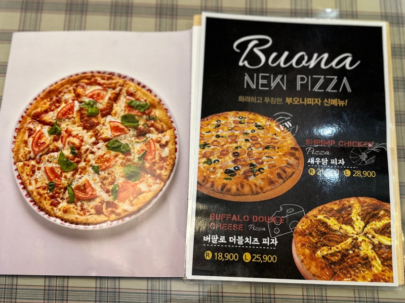 부오나피자의 추천 메뉴는 '부오나스페셜피자'와 '버팔로더블치즈피자'예요. 특히 부오나스페셜피자는 다양한 토핑이 조화를 이루어 정말 맛있답니다. 가격은 중 사이즈가 19,900원, 대 사이즈가 25,900원이니 참고하세요.