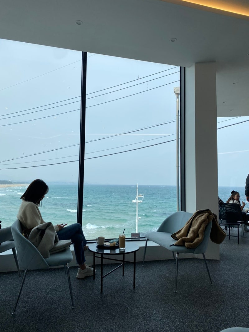 내부는 현대적이고 세련된 인테리어로 꾸며져 있으며, 편안한 의자와 테이블이 배치되어 있어요. 특히, 큰 창문을 통해 들어오는 자연광이 아늑한 분위기를 더해줍니다. 바다의 파도 소리를 들으며 커피 한 잔을 즐기는 것은 정말 특별한 경험이죠.