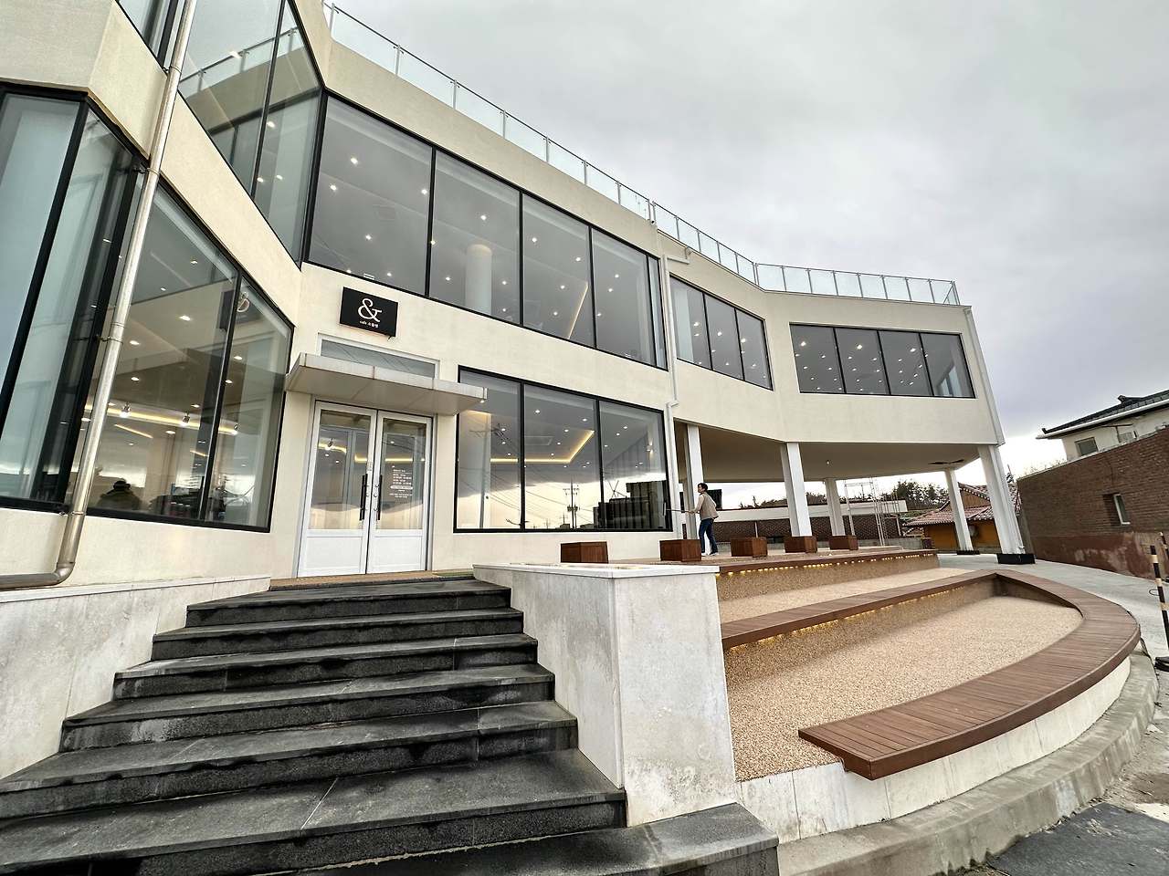 소돌엔 강릉은 강릉 주문진에 위치해 있으며, 바다 바로 앞에 자리 잡고 있어요. 이곳은 대형 카페로, 넓은 공간과 함께 멋진 바다 전망을 제공합니다. 카페의 외관은 현대적이고 세련된 디자인으로, 큰 유리창을 통해 자연광이 가득 들어옵니다.