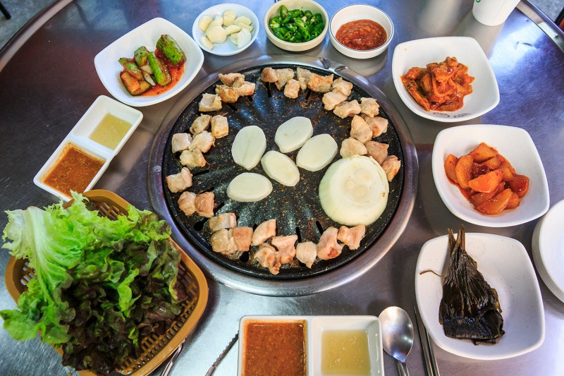 이 사진은 그릴에 구워진 삼겹살이야. 고소하고 바삭한 식감이 일품이야.