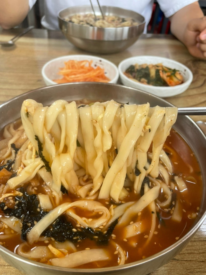 식당 분위기는 전통적인 한국식 느낌이 물씬 나. 나무 테이블과 의자, 그리고 소박한 인테리어가 아늑함을 더해줘. 특히, 칼국수를 먹으면서 느끼는 그 따뜻한 분위기는 정말 좋았어.
