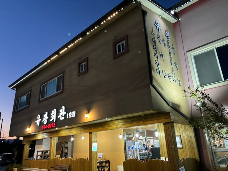 유광회관은 강릉 노암동에 위치해 있어요. 이곳은 넓은 홀과 아늑한 분위기로 단체 식사나 모임 예약도 가능하답니다. 외관은 나무와 페인트로 조화롭게 꾸며져 있어, 저녁에 조명이 켜지면 더욱 아름답게 빛나요.