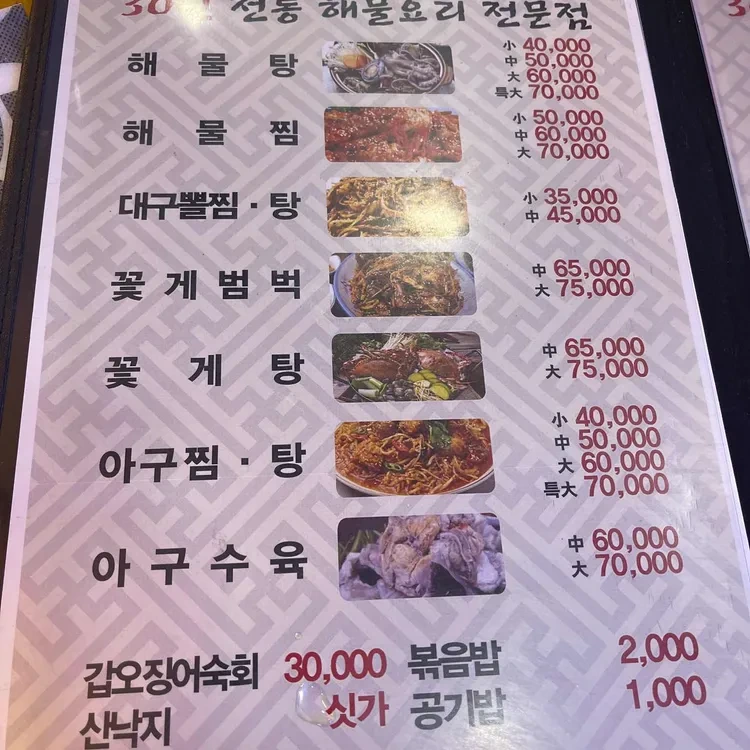이곳의 메뉴는 다양하지만, 특히 해물탕이 가장 추천할 만한 메뉴입니다. 해물탕의 가격은 50,000원으로, 푸짐한 양과 풍부한 맛을 고려했을 때 매우 합리적인 가격이에요. 해물탕에는 신선한 대하, 꽃게, 조개 등 다양한 해물이 들어가고, 매콤한 국물의 깊은 맛이 일품입니다.
