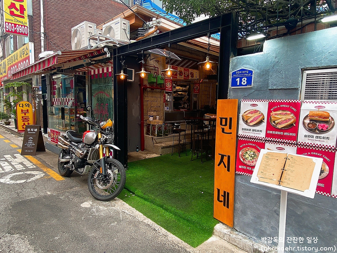 민지네의 메뉴는 다양하고 맛있기로 유명해요. 특히, 잠봉뵈르와 킬바사 소세지가 인기 메뉴인데요, 가격은 각각 8,000원과 7,000원 정도로 합리적이에요.