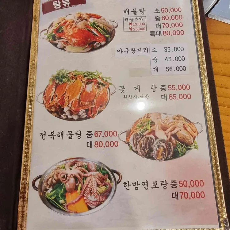 호남집의 대표 메뉴는 해물탕이에요. 해물탕은 신선한 해산물이 가득 들어가 있어, 깊고 진한 국물 맛이 일품이에요. 가격은 사이즈에 따라 50,000원에서 80,000원까지 다양해요. 그 외에도 아구탕지리(35,000원~56,000원), 꽃게탕(55,000원~65,000원), 전복해물탕(67,000원~80,000원), 한방연포탕(50,000원~70,000원) 등 다양한 해물 요리가 준비되어 있어요.