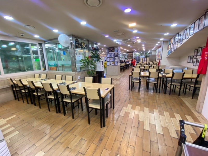 식당 내부는 넓고 깔끔하게 정돈되어 있었어요. 나무 테이블과 의자가 배치되어 있어 아늑한 느낌을 주고, 벽에는 다양한 사진들이 걸려 있어요. 자연광이 잘 들어와서 밝고 쾌적한 분위기였어요.