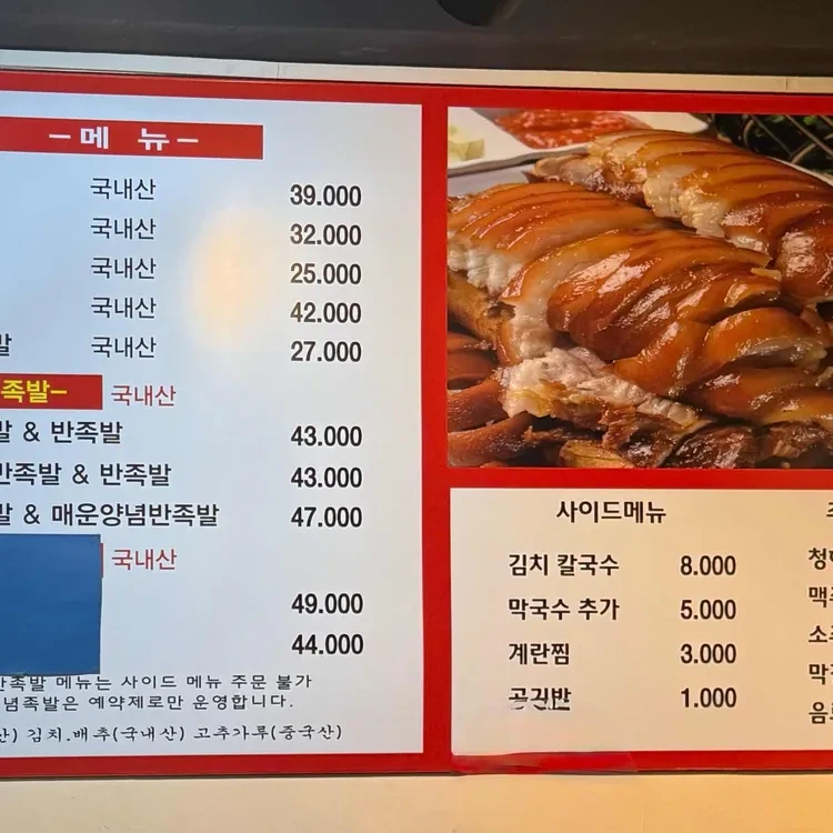이 외에도 김치 칼국수는 8,000원으로 가성비가 좋고, 다양한 사이드 메뉴도 있어요. 족발은 양이 많아서 포장해 가는 분들도 많답니다.