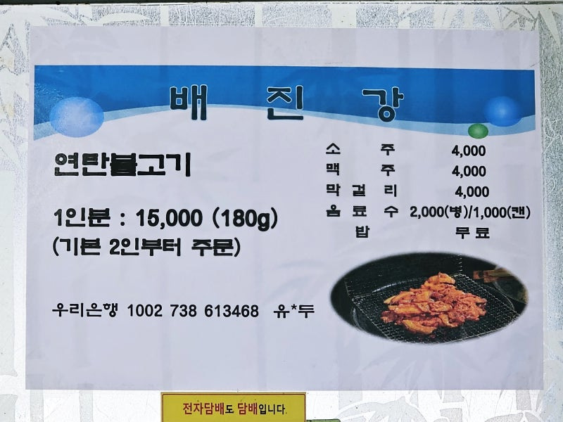 배진강의 메뉴는 다양하지만, 가장 인기 있는 메뉴는 연탄불고기예요. 가격은 15,000원에 180g으로, 최소 2인분 이상 주문해야 해요. 이 외에도 소주, 맥주, 막걸리 등 다양한 음료도 준비되어 있어요. 소주는 4,000원, 맥주는 4,000원, 막걸리는 4,000원, 그리고 음료수는 2,000원에 판매되고 있어요. 밥은 무료로 제공되니, 부담 없이 즐길 수 있어요.