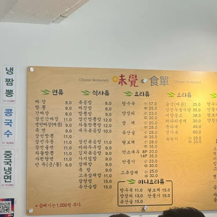미각의 메뉴는 다양하고 가격대도 합리적이에요. 메뉴판을 보면, 짜장면, 짬뽕, 볶음밥 등 다양한 중식 요리가 준비되어 있어요.