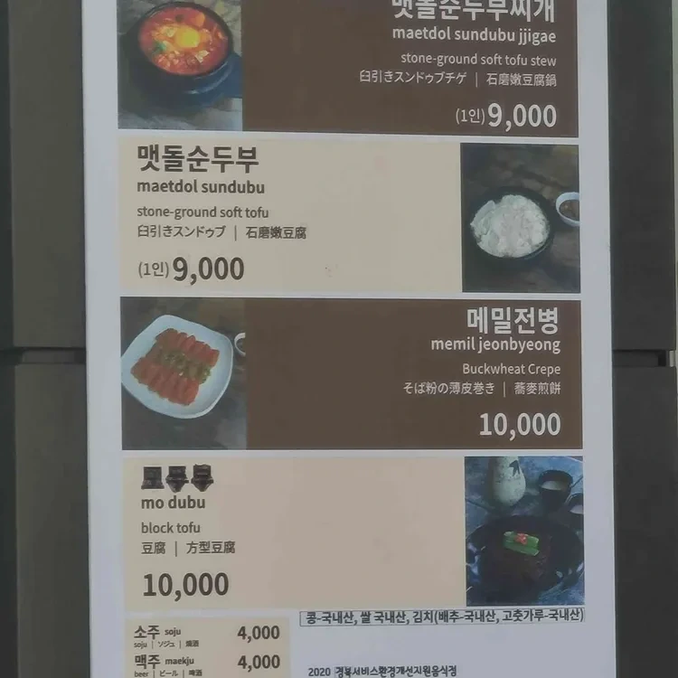 이 외에도 맷돌순두부(9,000원), 메밀전병(10,000원), 모두부(10,000원) 등 다양한 메뉴가 준비되어 있어요. 음료로는 소주(4,000원)와 맥주(3,000원)도 판매하고 있어, 식사 후 한 잔 하기에 좋답니다.