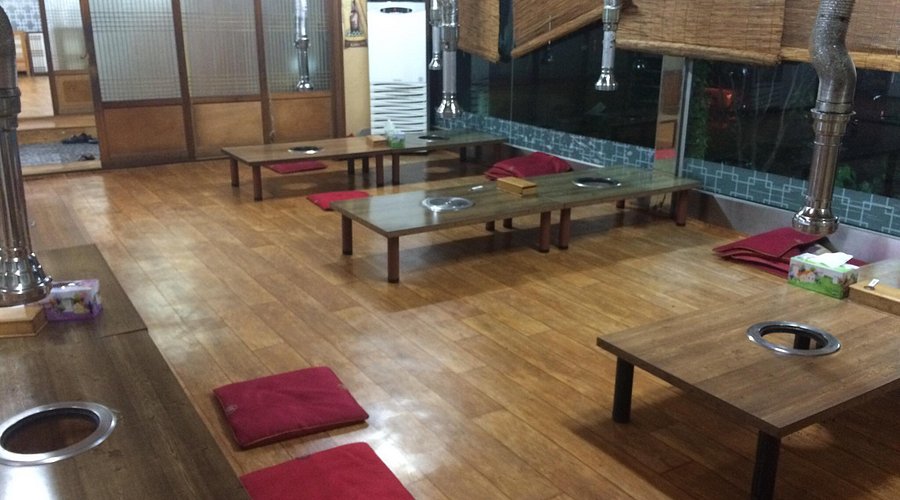 식당 내부는 나무로 꾸며져 있어 따뜻하고 아늑한 느낌을 줘요. 각 테이블마다 그릴이 설치되어 있어, 직접 고기를 구워 먹는 재미도 느낄 수 있어요. 특히, 자연광이 들어오는 큰 창문 덕분에 밝고 쾌적한 분위기에서 식사를 즐길 수 있어요.