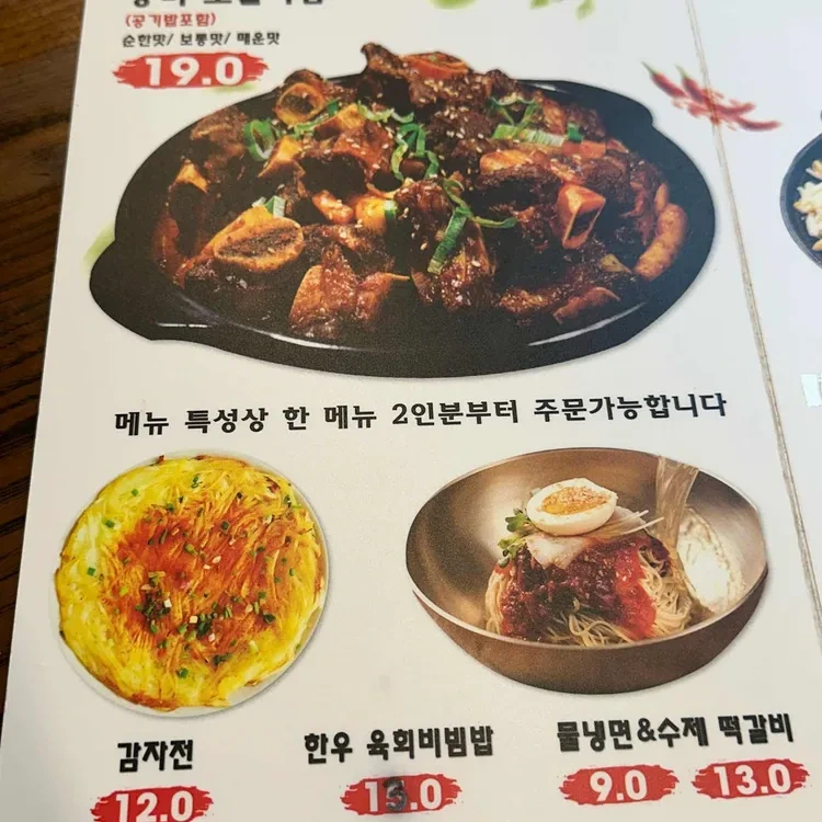 이 갈비찜은 부드러운 소갈비가 매콤한 양념에 푹 익혀져 정말 맛있답니다. 가격은 19,000원으로, 두 사람이 나눠 먹기에도 적당한 양이에요. 그 외에도 '한우 육회비빔밥'이 15,000원, '감자전'이 12,000원, 그리고 '물냉면'과 '수제 떡갈비'가 각각 9,000원과 13,000원으로 제공되고 있어요.