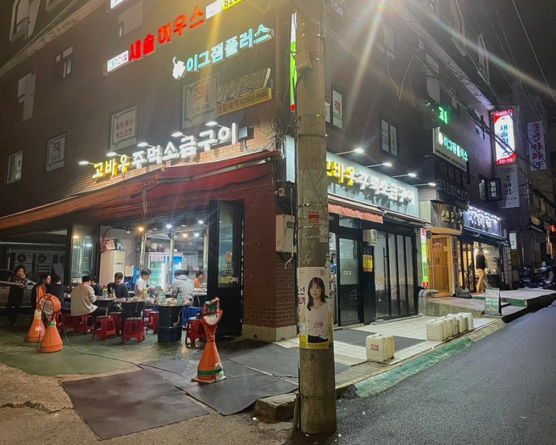 고바우주먹구이는 노량진역 근처에 위치해 있어요. 외관은 벽돌로 된 아늑한 느낌의 건물로, 입구에는 빨간 플라스틱 의자와 테이블이 놓여 있어요.