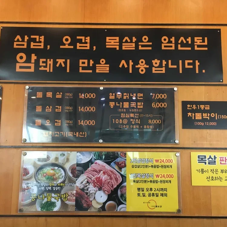 이곳의 메뉴는 주로 삼겹살과 관련된 다양한 고기 요리로 구성되어 있어요. 특히, 삼겹살, 오겹살, 목살이 인기 메뉴인데요, 각각 180g 기준으로 14,000원이랍니다.
