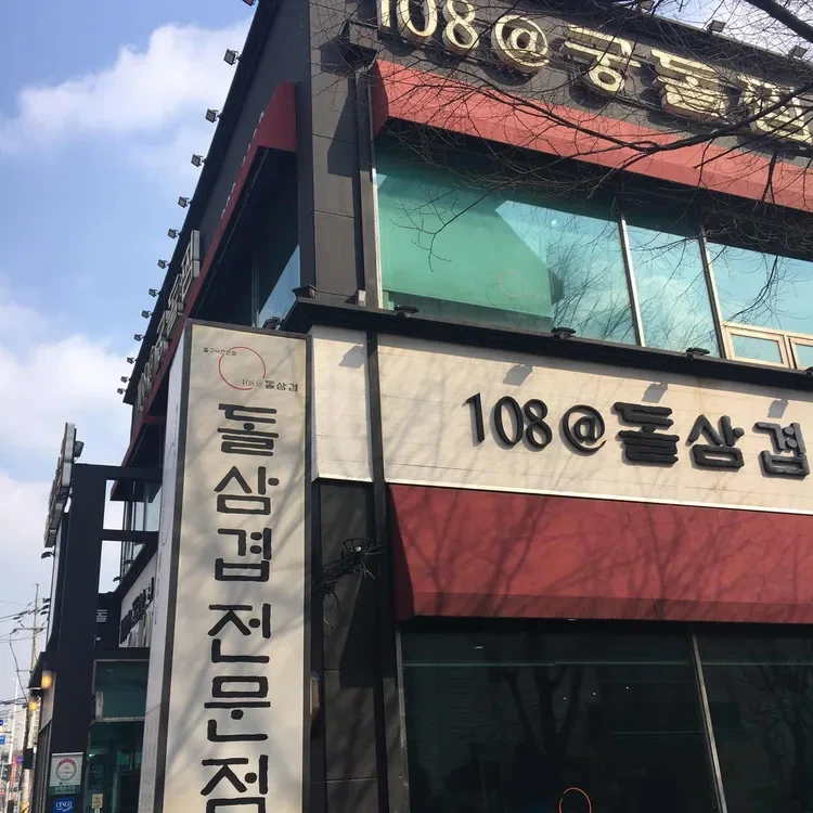 식당의 간판에는 '108@돌삼겹'이라는 이름이 크게 적혀 있어 쉽게 찾을 수 있어요. 주변은 도심의 분위기가 물씬 풍기며, 주차 공간도 마련되어 있어 편리해요.