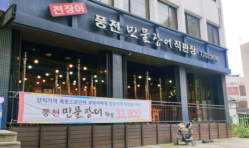 풍천민물장어작판장은 공덕역에서 도보로 약 5분 거리에 위치해 있어요. 이곳은 외관부터 현대적인 느낌이 물씬 풍기는데요, 큰 창문과 세련된 디자인이 인상적이에요. 특히, 입구에 걸린 배너에는 1kg의 민물장어가 33,900원이라는 가격이 적혀 있어요. 가족 단위 손님도 많이 방문하는 것 같아 보였어요.