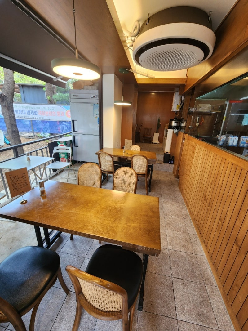 나무로 된 테이블과 의자들이 조화를 이루며, 큰 창문을 통해 들어오는 자연광이 공간을 밝게 만들어 줘요. 또한, 벽면에는 다양한 아트워크가 걸려 있어 시각적으로도 즐거움을 주는 곳이에요. 친구들과 함께 오거나, 혼자서도 편안하게 식사할 수 있는 분위기랍니다.