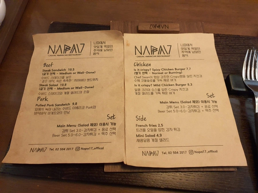 나파세븐틴의 메뉴는 다양하고 푸짐해요. 특히 수제버거와 스테이크가 인기인데요, 메뉴판을 보면