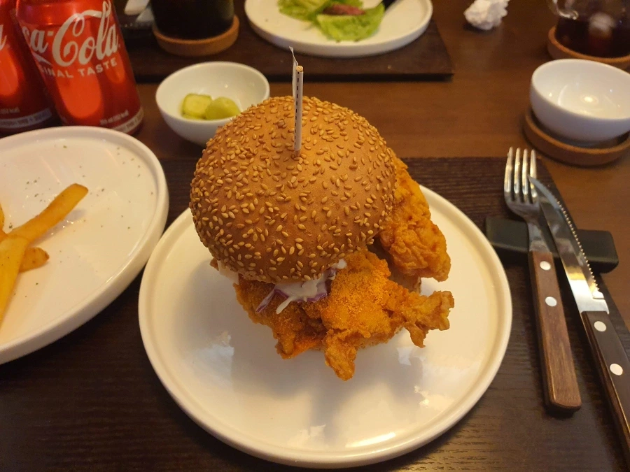 치킨 버거와 프렌치 프라이가 함께 나오는 모습이 정말 맛있어 보이죠? 이곳은 친구들과의 모임이나 가족과의 외식에 적합한 장소랍니다.