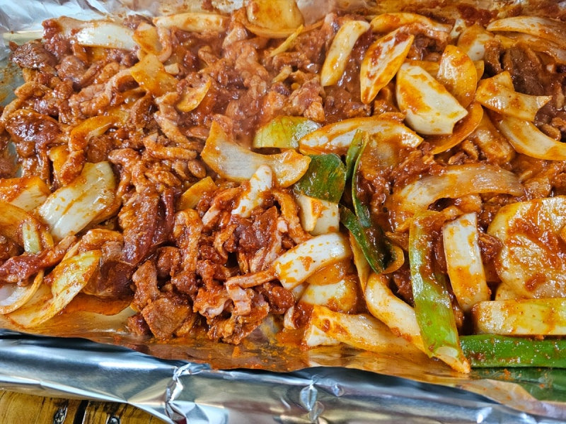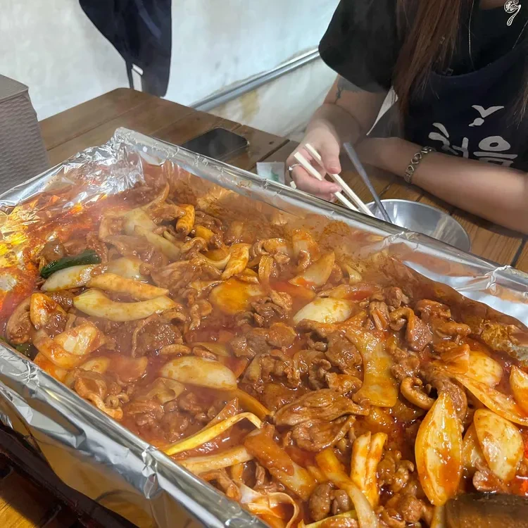 오리주물럭을 주문하면 큰 트레이에 나오는 모습이 정말 인상적이에요. 고기와 채소가 푸짐하게 담겨 있어 시각적으로도 만족스러워요.