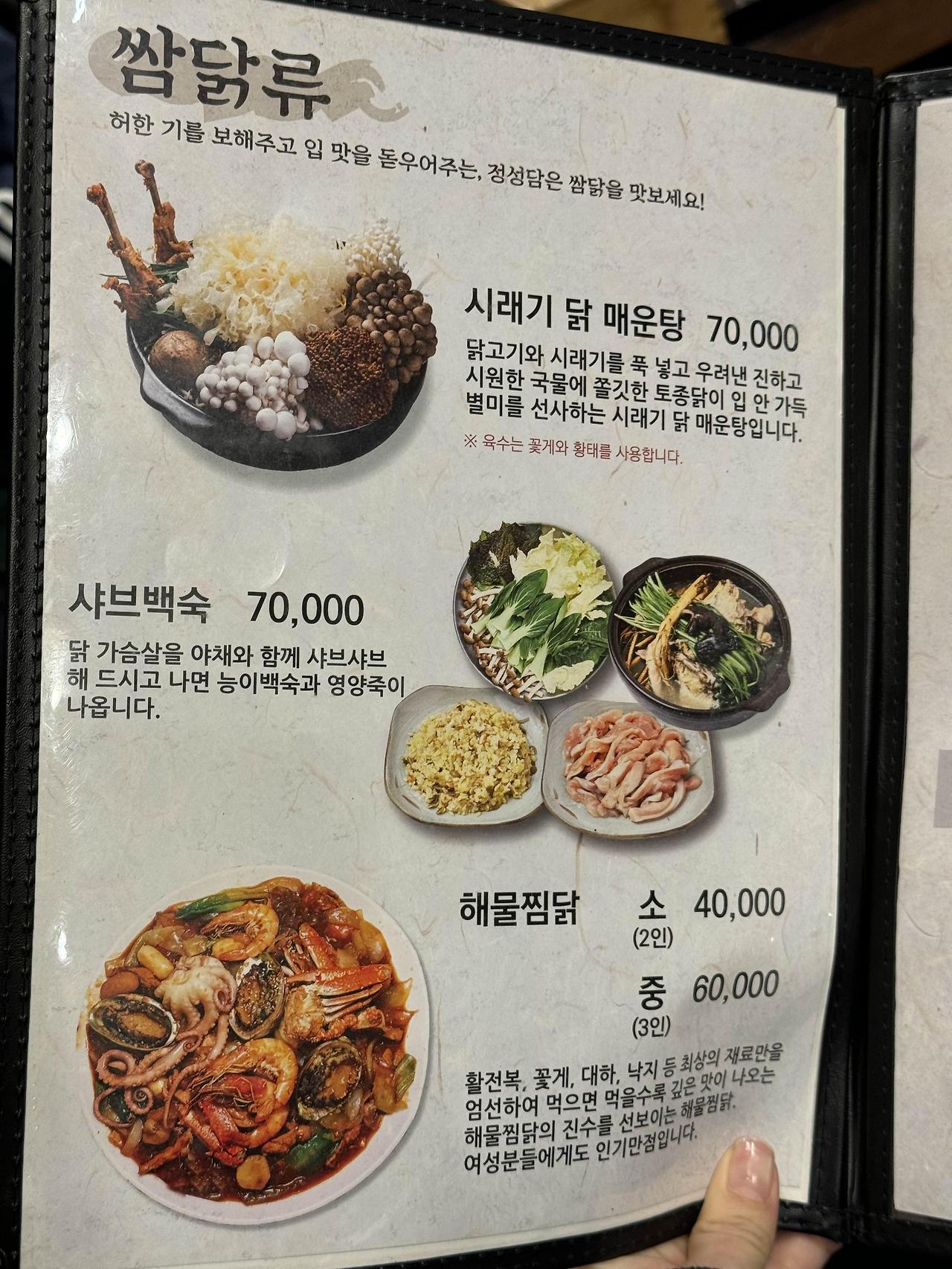 메밀장터의 메뉴는 정말 다양해요. 대표 메뉴인 메밀국수는 물론, 시래기 닭 매운탕(70,000원), 샤브백숙(70,000원), 해물찜닭(40,000원~60,000원) 등 여러 가지가 있어요. 특히 메밀국수는 100% 순 메밀로 만들어져서 메밀의 향긋함이 남다르답니다.