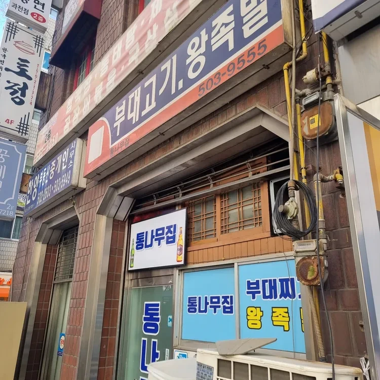 통나무집은 과천 정부청사 근처에 위치해 있어요. 이곳은 부대찌개와 족발 전문점으로, 외관부터 아늑한 느낌을 주는 통나무 스타일의 건물이에요.