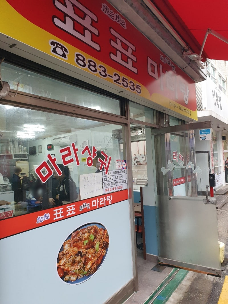 표표마라탕은 관악구의 번화가에 위치해 있어요. 외관은 밝은 빨강과 노랑의 조화로 눈에 띄고, 입구에는 큰 마라탕 사진이 걸려 있어요.