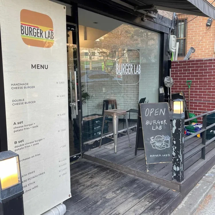 버거랩은 서울 관악구 신림로12길 5에 위치해 있어요. 이곳은 대학가 근처에 있어 학생들과 직장인들이 자주 찾는 곳이에요. 외관은 아담하고 아늑한 느낌을 주며, 입구에는 다양한 메뉴가 적힌 배너가 걸려 있어요.