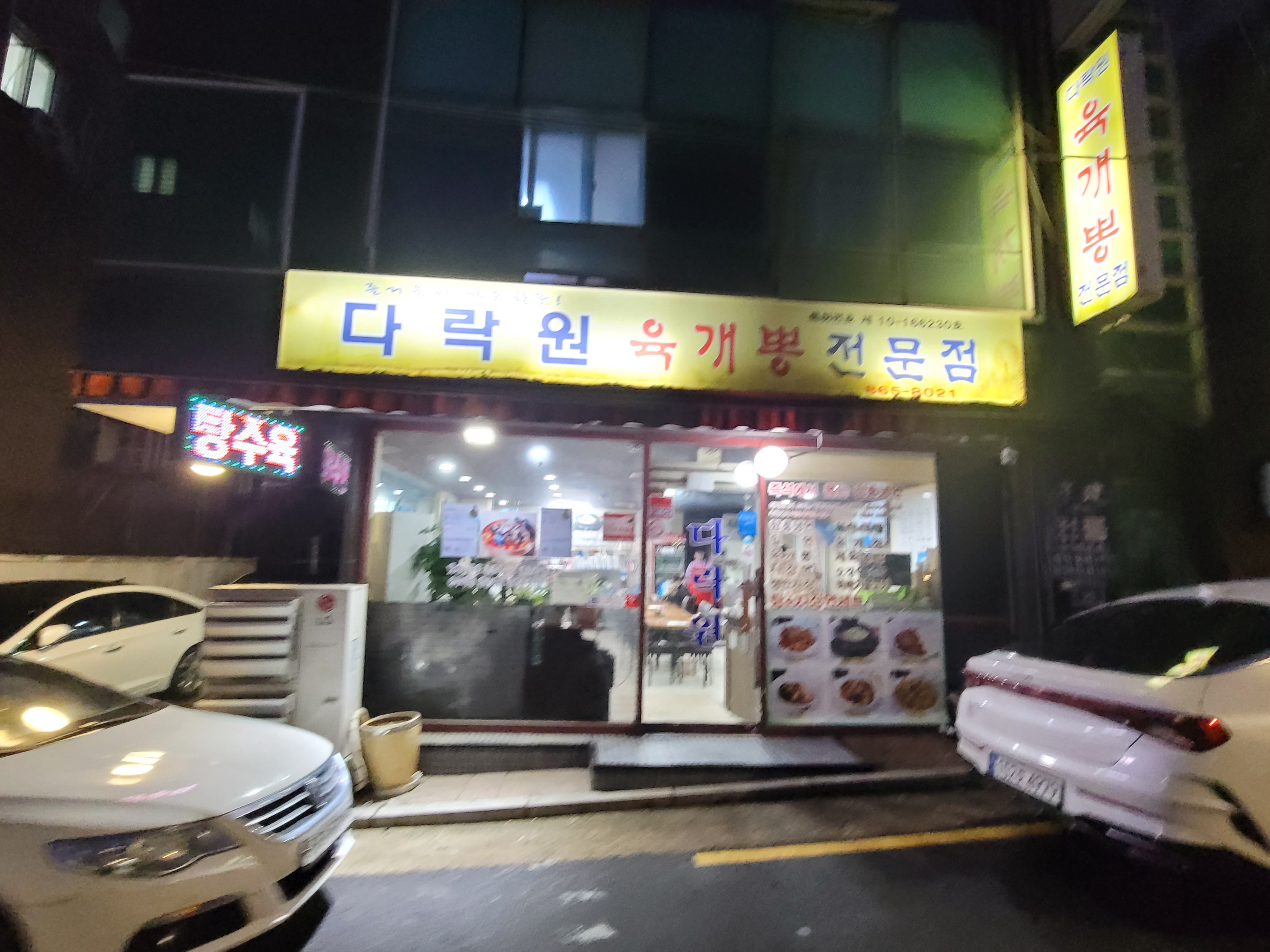 다락원 육개뽕 전문점은 서울 관악구 신림동에 위치해 있어요. 이곳은 육개장과 짬뽕을 결합한 독특한 메뉴인 육개뽕으로 유명한 곳이에요. 식당 외관은 밝은 노란색 간판이 눈에 띄고, 큰 유리창을 통해 내부가 잘 보이도록 되어 있어요.