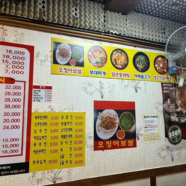 이곳의 추천 메뉴는 단연 부대찌개에요. 부대찌개는 1인분에 7,000원부터 시작하며, 양이 넉넉해서 혼자 가셔도 충분히 만족하실 수 있어요. 또한, 오징어보쌈은 15,000원으로, 신선한 오징어와 함께 제공되는 다양한 소스가 일품이에요. 메뉴판을 보면 다양한 가격대의 메뉴가 있어 선택의 폭이 넓어요.
