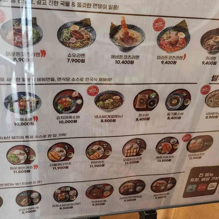 면식당의 메뉴는 정말 다양해요. 대표적인 메뉴로는 매운돈코츠라멘(8,900원), 에비돈코츠라멘(10,400원), 김치마제소바(10,000원) 등이 있어요.