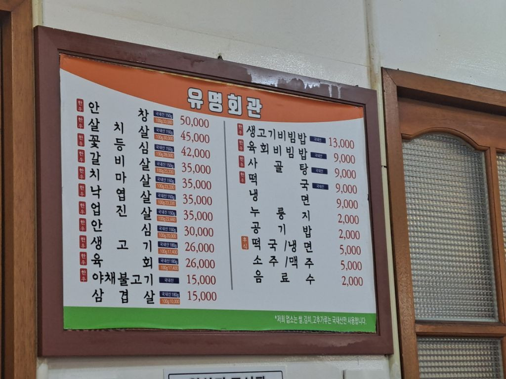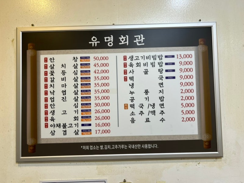 유명회관의 메뉴는 다양해요. 특히 추천하고 싶은 메뉴는 생고기비빔밥과 안살곱창이에요. 생고기비빔밥은 신선한 육회와 다양한 채소가 어우러져 정말 맛있어요. 가격은 대략 10,000원에서 50,000원까지 다양해요.