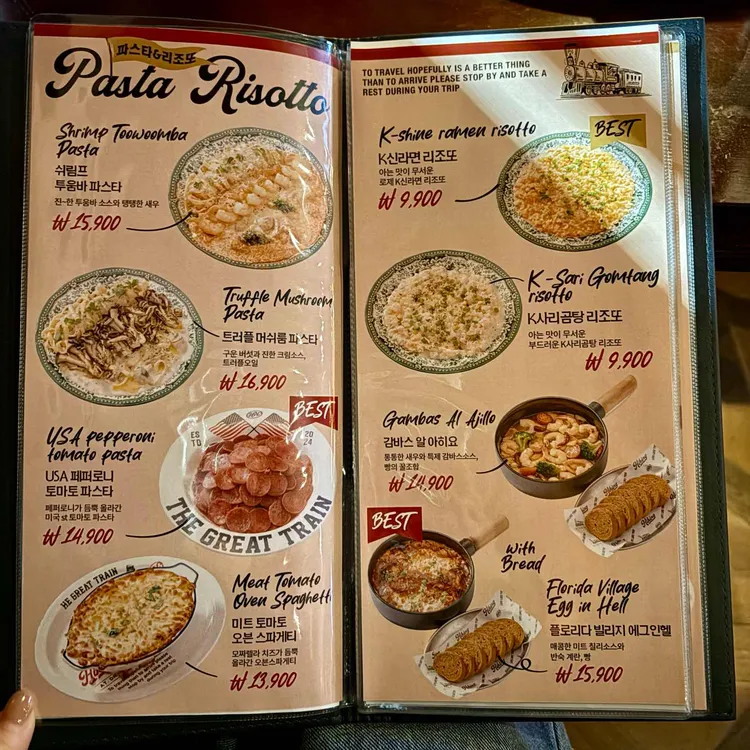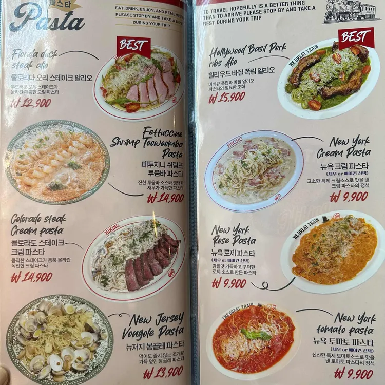 하이킹의 메뉴는 정말 다양해요. 파스타, 리조또, 스테이크, 피자 등 여러 가지가 준비되어 있답니다. 특히 추천하고 싶은 메뉴는 'K-Shine Ramen Risotto'와 'K-Sari Gomtang Risotto'로, 가격은 각각 9,900원이에요.