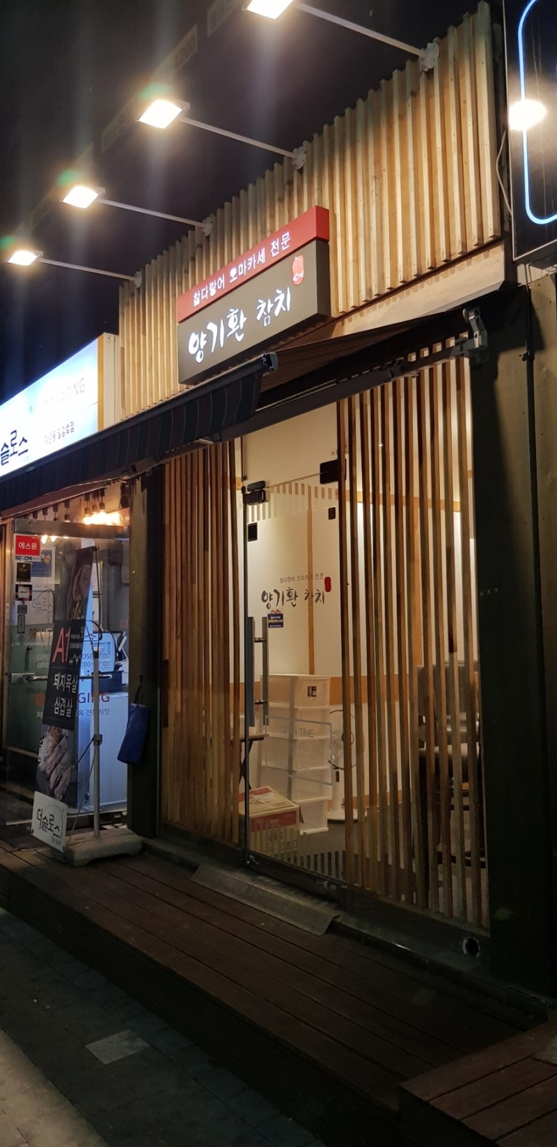 식당의 외관은 아늑하고 따뜻한 느낌을 주는 나무 슬랫과 유리문으로 되어 있어요. 밤에 가면 조명이 아늑하게 비추어져 더욱 매력적이랍니다. 내부는 깔끔하고 현대적인 인테리어로 꾸며져 있어, 편안하게 식사를 즐길 수 있는 분위기예요.