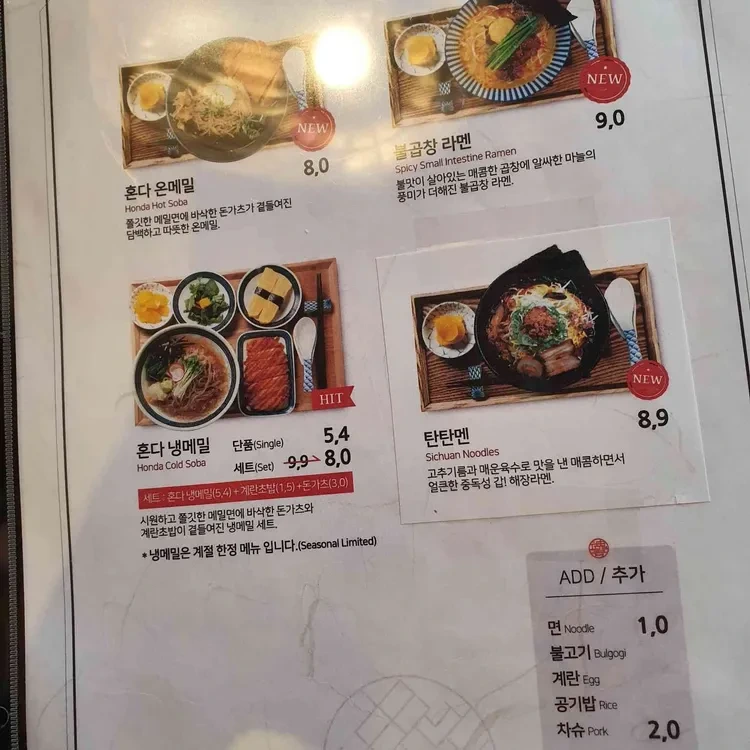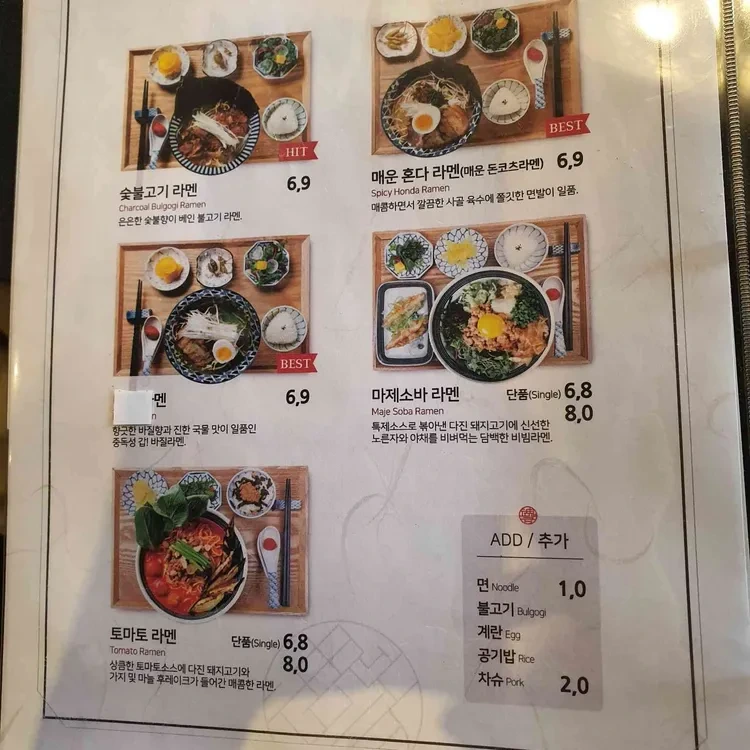 혼다라멘의 메뉴는 다양해요. 기본적인 혼다라멘 외에도 매운 돈코츠 라멘, 탄탄멘, 그리고 다양한 사이드 메뉴가 있어요. 가격대는 대체로 7,000원에서 10,000원 사이로, 가성비가 뛰어난 편이에요.